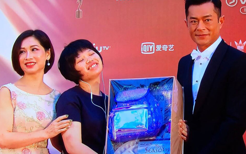 2018年香港電影金像獎的主題是罕有病,我和女兒獲邀行紅地毯。那時我已經計劃年底辦花式跳繩籌款,於是準備好計劃書,叫瑤瑤抄寫兩個信封,準備當晚交給古天樂和劉德華爭取支持,但是沒想到入場便因為保安理由被沒收手袋,計劃書不在身上。上台後,古天樂剛好站我身旁,我不理前面幾百對眼睛,立即邀請他參與,說計劃書一會補上,他答:「咁認真?有意義,我幫你!」可惜活動跟他的工作撞期,我唯有向「金像同行」求助,最後找到Sammi(鄭秀文)出席活動。